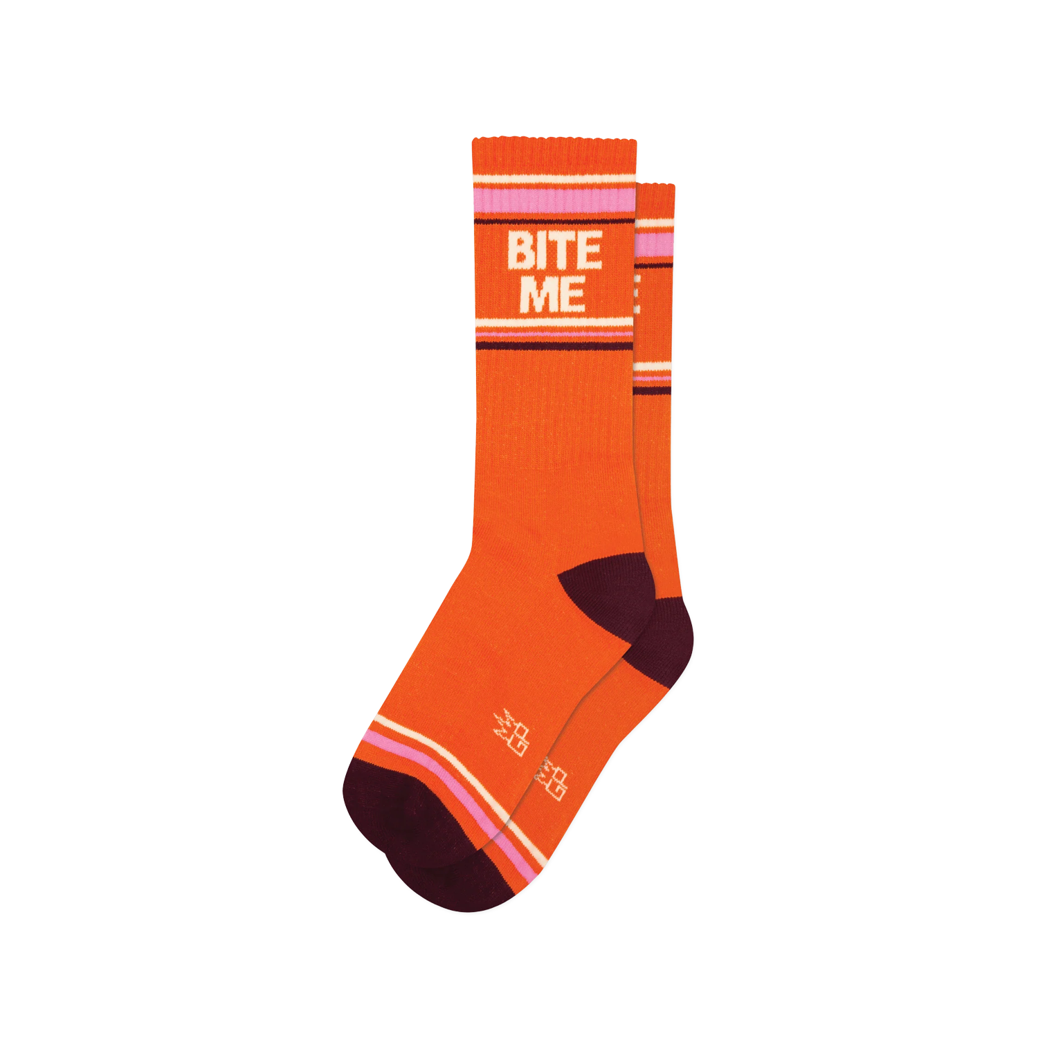 These super-comfy, unisex, one-size-fits-most Gym Socks are made in the USA of Orange Cotton with accents of Maroon Nylon, Cream Nylon, Bobby Pink Nylon.
