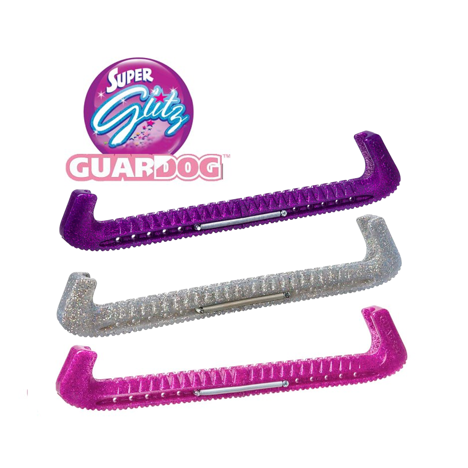 Protège-patins Super GlitZ en 3 parties avec ressort central. Deux fois plus de paillettes ! Couleurs éblouissantes au choix. Protection optimale de la lame.